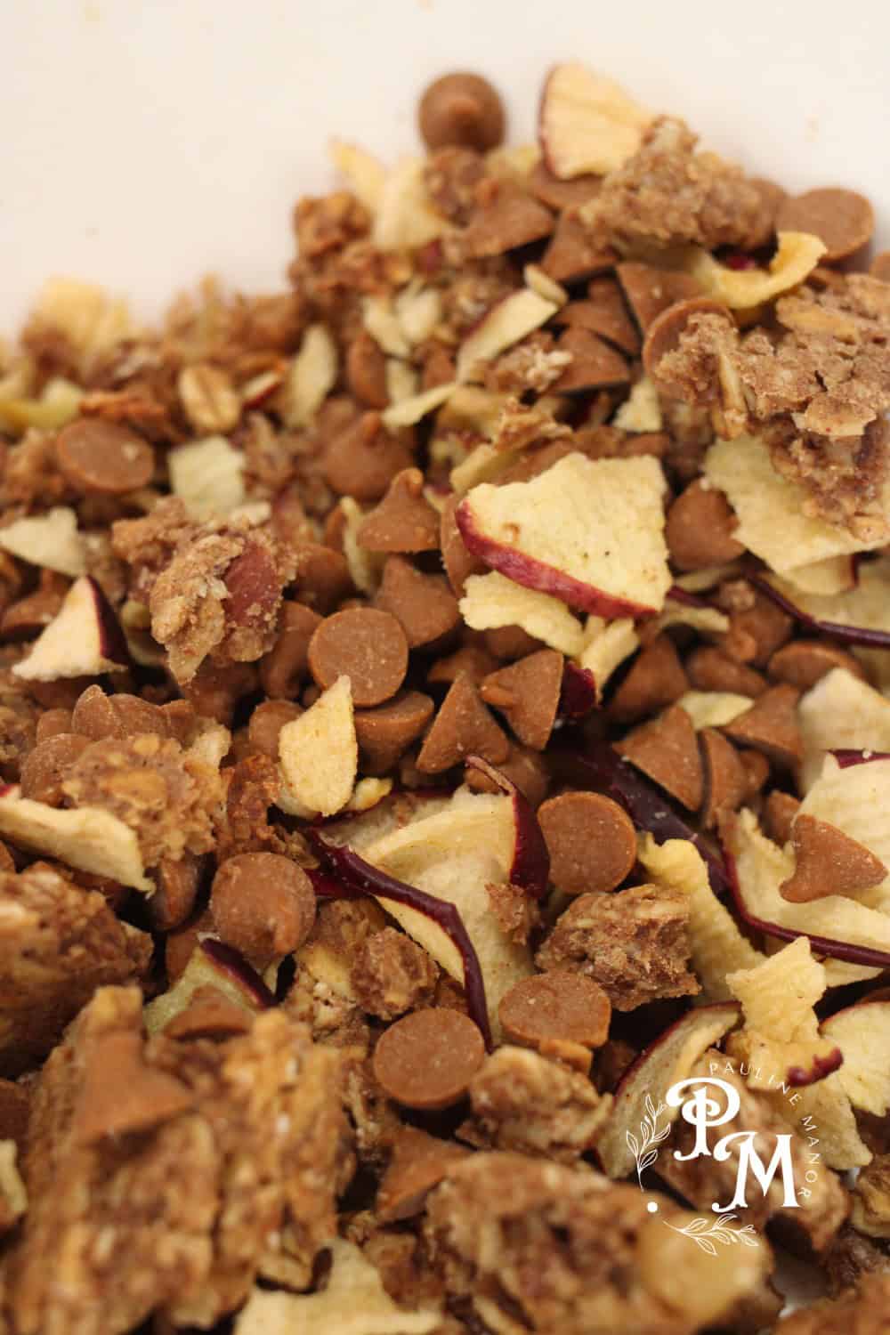 • Let it cool completely before stirring in the dried apples and cinnamon chips. It will crisp up as it cools.